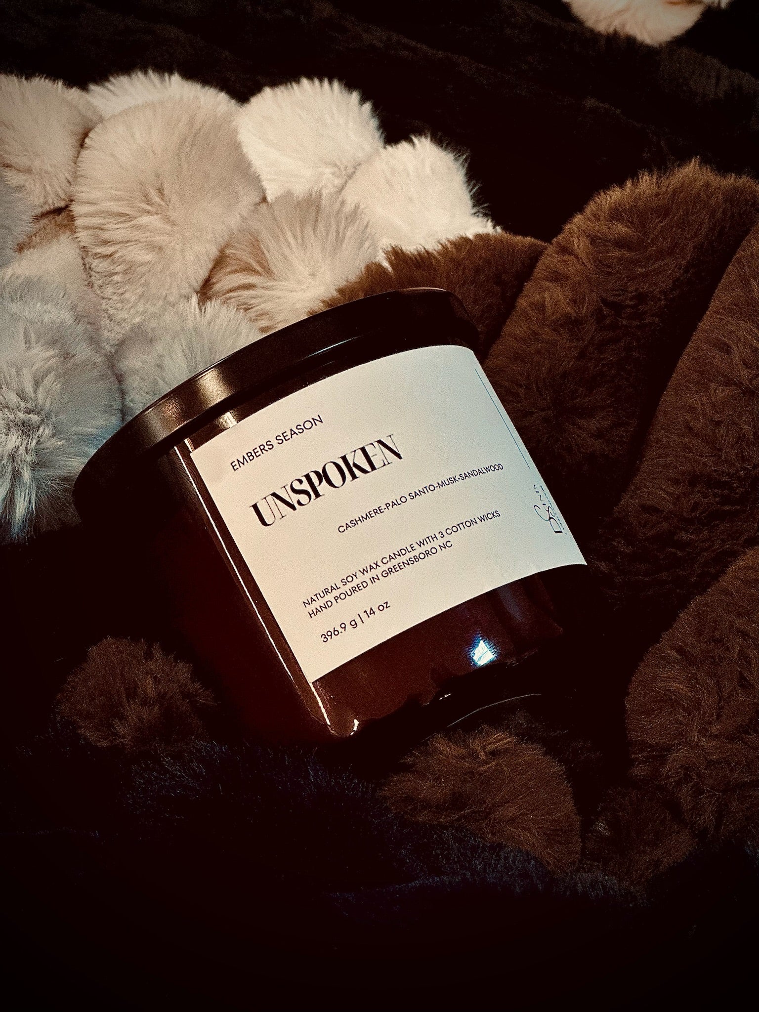 A quiet intensity lingers in Unspoken. It begins with soft musk and the gentle smoke of palo santo, a breath of mystery rising through the air. As the flame deepens, sandalwood unfurls its grounding warmth, weaving serenity into the silence.
